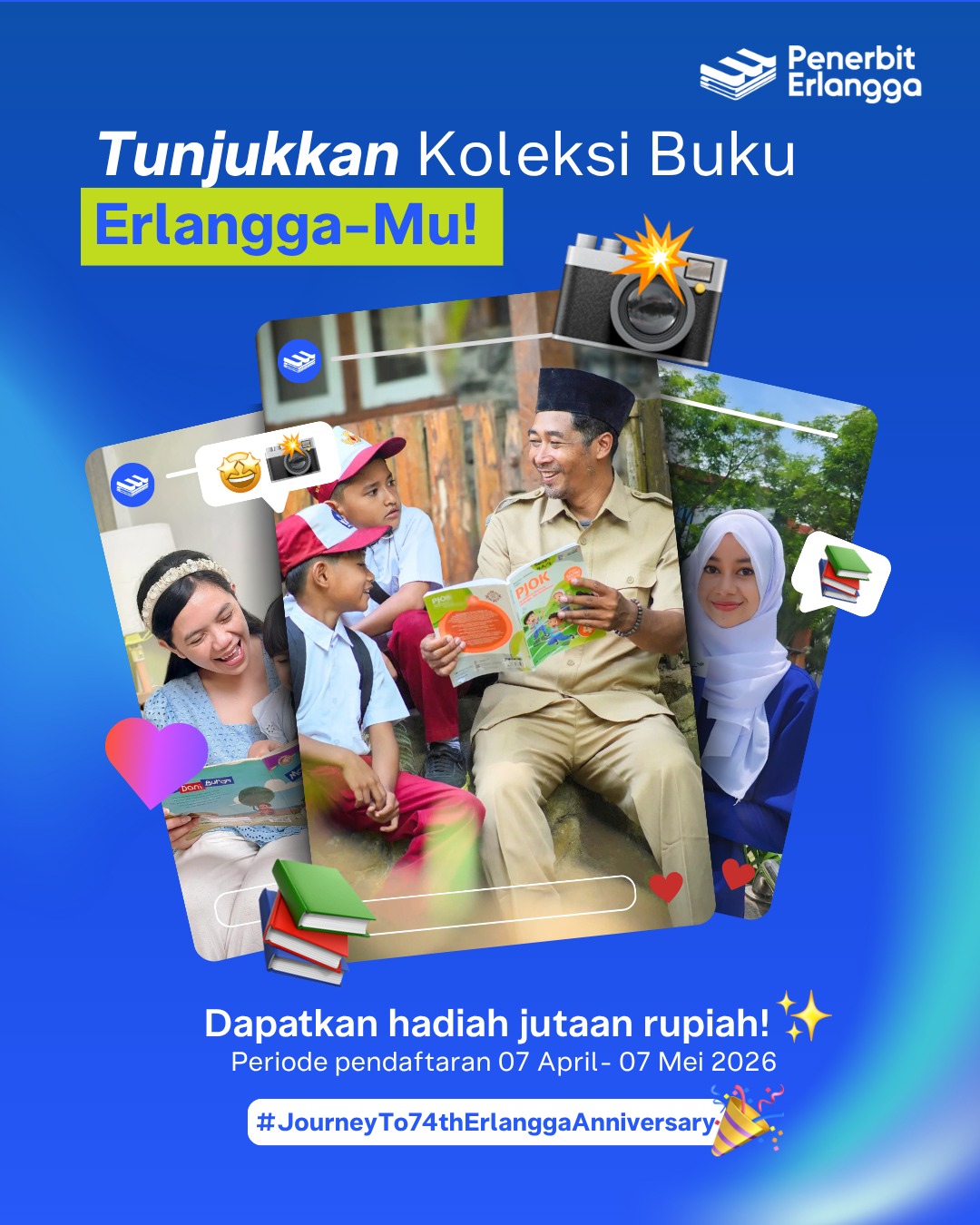 Punya koleksi buku Erlangga di rumah? Jangan cuma dipajang! Yuk, ikutan lomba foto #JourneyTo74thErlanggaAnniversary dan bagikan momen seru kamu bersama buku Erlangga favorit.