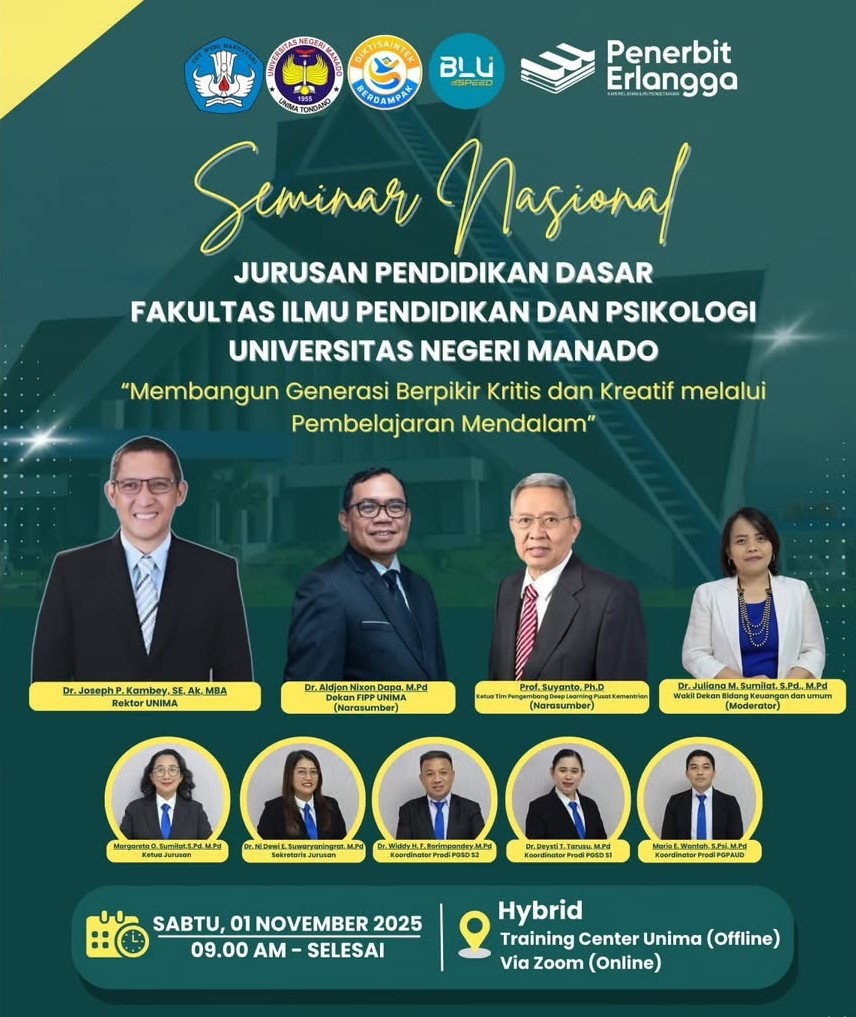 Acara dibuka oleh bapak Prof. Dr. Mister Gidion Maru, M.Hum. (Wakil Rektor I UNIMA), bapak Tommy Wuwungan, S.Pd. (Kepala Dinas Pendidikan Kabupaten Minahasa), dan Dr. Aldjon Dapa, M.Pd. (Dekan FIPP UNIMA), serta dihadiri oleh bapak Rendra Yuwana (Kepala Cabang Penerbit Erlangga Manado). Seminar ini menghadirkan Prof. Suyanto, penulis buku Pembelajaran Mendalam, sebagai narasumber utama. Dalam paparannya, Prof. Suyanto menekankan pentingnya pembelajaran yang berfokus pada pemahaman konseptual, berpikir kritis, serta kreativitas peserta didik agar siap menghadapi tantangan abad ke-21.