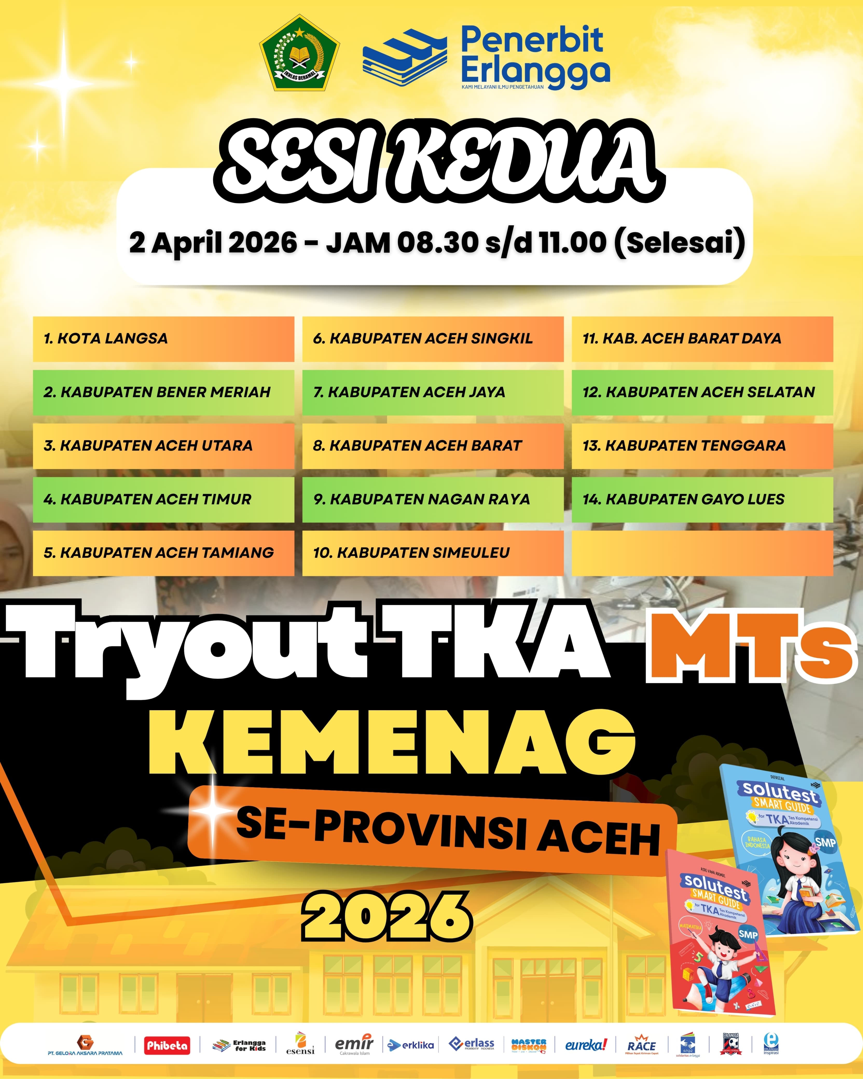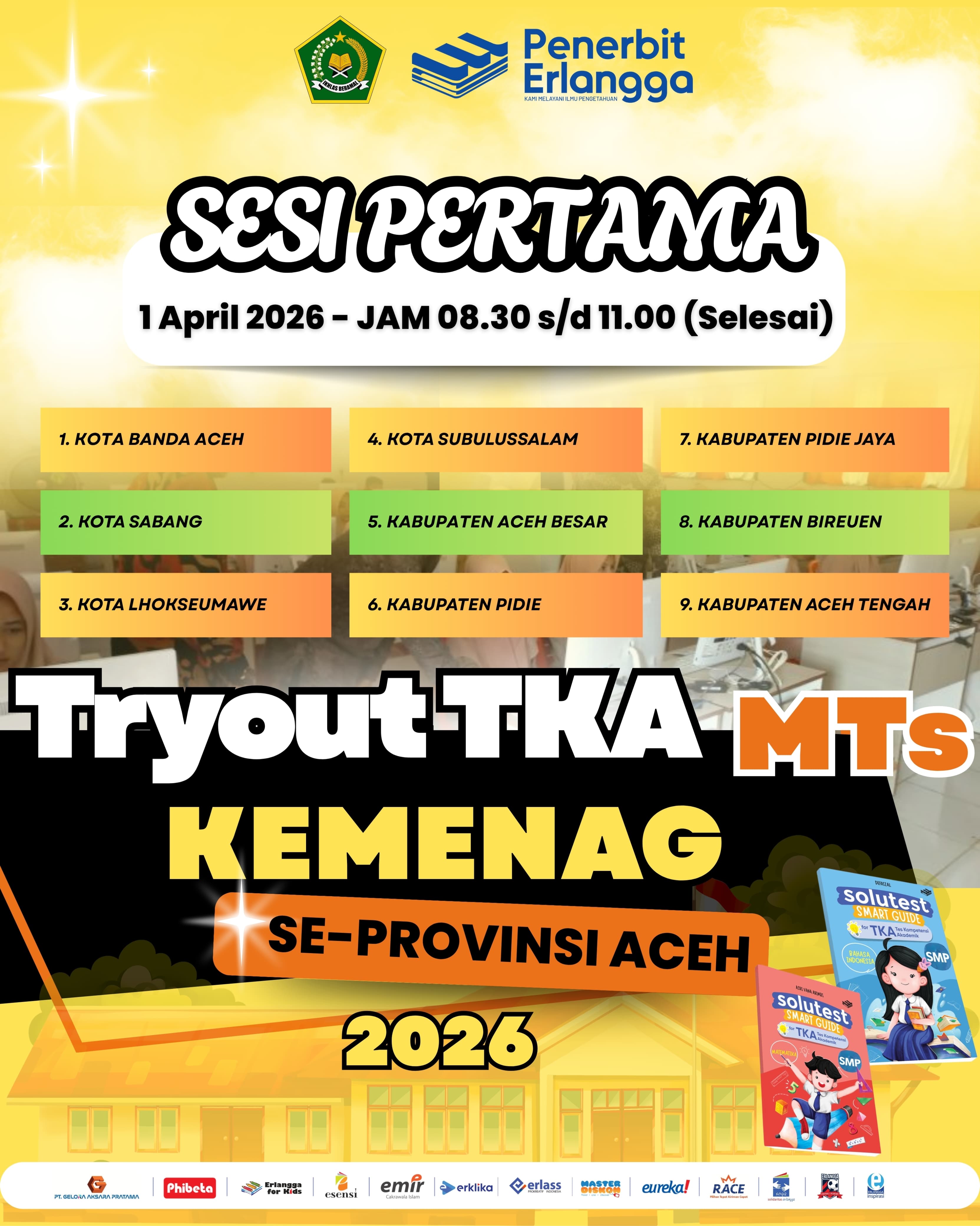 Dalam upaya berkelanjutan meningkatkan mutu pendidikan dan kesiapan akademik siswa, Penerbit Erlangga menjalin kolaborasi strategis dengan Kantor Wilayah Kementerian Agama (Kemenag) Provinsi Aceh. Kerja sama ini diwujudkan melalui penyelenggaraan Tryout Tes Kompetensi Akademik (TKA) jenjang Madrasah Tsanawiyah (MTs) tingkat Provinsi tahun 2026 yang dilaksanakan serentak pada awal April 2026.