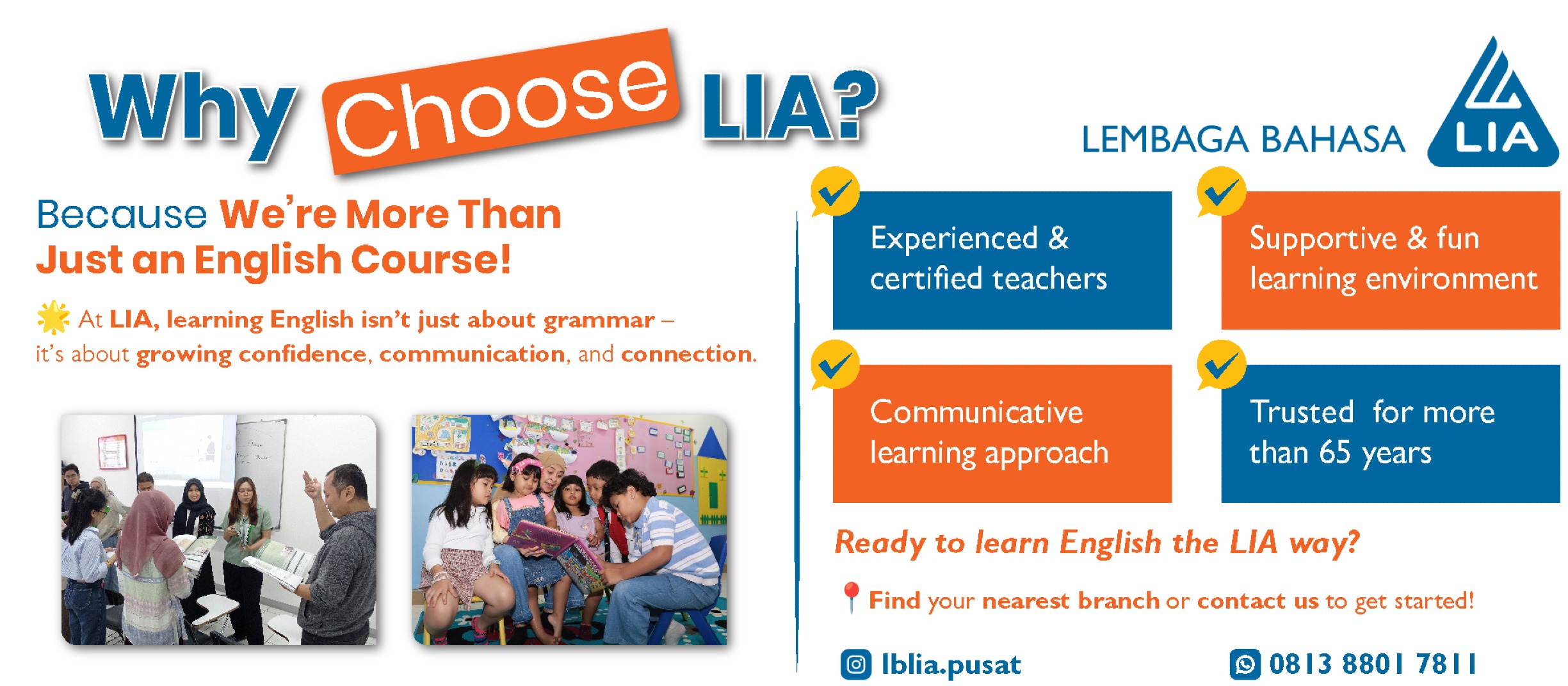Karena kita lebih dari tempat les Bahasa Inggris biasa! Di LIA, belajar Bahasa Inggris bukan hanya soal grammar, tapi juga membangun kepercayaan diri, komunikasi, dan koneksi.